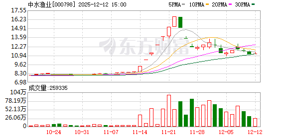 | 251120 | 中水渔业 | 登录 | 水产养殖 | 观察者网:中国暂停进口日本水产品 | 中国农业发展集团旗下,主营远洋水产品,有金枪饺子、金枪鱼圈等预制食品 | 10.02 | 13.72 | 14.92% | 7.46亿 | 50.19亿 | 50.2亿 99.99% | 8378.25 6.11万手 | 11.22% | 092500 141824 | 2 | 5 | 农牧饲渔 | 农牧饲渔,北京板块,中字头,水产养殖,央... 更多 |