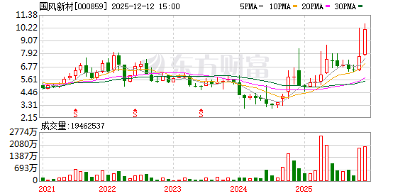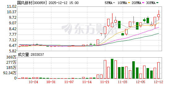 | 241217 | 国风新材 000859 2/2 | 登录 | 《3日榜》 温州帮:636.15 机构专用:-436.8 低位挖掘:624.48 净额:823.83 | 公告+资产重组 | 1、公司拟购买金张科技58.33%股权,标的公司自主研发并掌握了功能膜材料产品研发和生产核心技术,专... 更多 | 10.03 | 7.02 | 0.23% | 1446.92万 | 62.89亿 | 62.9亿 99.99% | 3.83亿 54.55万手 | 2646.75% | 092500 092500 | 0 | 2 | 塑料制品 | 塑料制品,安徽板块,融资融券,预亏预减,... 更多 |
