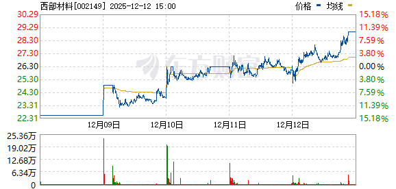 | 250220 | 西部材料 002149 1/1 | 登录 | 有色金属 | 公司拥有钛及钛合金加工材、稀有金属装备、钨钼材料等,产品主要应用于军工、核电、环保、海洋工程、石化、... 更多 | 10.02 | 19.33 | 7.17% | 6.56亿 | 94.36亿 | 94.37亿 99.98% | 1.33亿 6.9万手 | 20.33% | 140300 140300 | 0 | 1 | 小金属 | 小金属,陕西板块,深股通,参股新三板,融... 更多 |