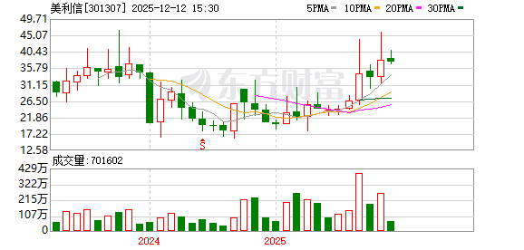 | 250916 | 美利信 | 登录 | 固态电池 | 宁德时代股价创历史新高;能源局印发《新型储能规模化建设专项行动方案(2025—2027年)》 | 公司具有为固态电池提供箱体类铝合金精密压铸件产品的能力和技术储备 | 20.00 | 40.38 | 24.74% | 10.32亿 | 44.01亿 | 85.04亿 51.75% | 8638.9 2.14万手 | 8.37% | 110245 110245 | 0 | 1 | 通信设备 | 通信设备,重庆板块,创业板综,深股通,融... 更多 |