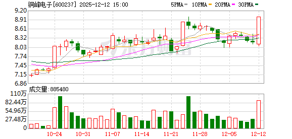 | 241025 | 铜峰电子 600237 1/1 | 登录 | 国企改革 | 铜陵市人民政府国资委旗下,公司主营薄膜电容器,下游包括新能源汽车、光伏、风电等 | 9.99 | 7.71 | 18.98% | 8.77亿 | 46.61亿 | 48.63亿 95.84% | 3093.42 4.01万手 | 3.53% | 092502 132544 | 4 | 1 | 电子元件 | 电子元件,安徽板块,融资融券,机构重仓,... 更多 |