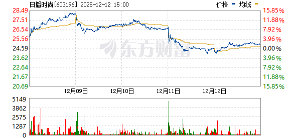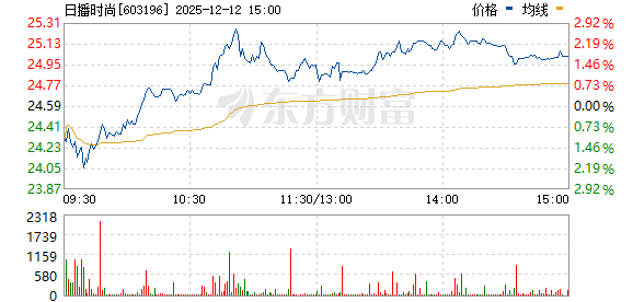 | 250718 | 日播时尚 603196 1/1 | 登录 | 大消费 | 全方位扩大国内需求调研协商座谈会7月16日在京召开 | 国内中高端女装优质企业,旗下童装品牌“broadcute”创立于2018年,品牌面向3-8岁儿童 | 10.01 | 19.24 | 3.77% | 1.67亿 | 45.6亿 | 45.6亿 100% | 5368.42 2.79万手 | 32.11% | 100957 100957 | 0 | 1 | 纺织服装 | 纺织服装,上海板块,预亏预减,并购重组概... 更多 |