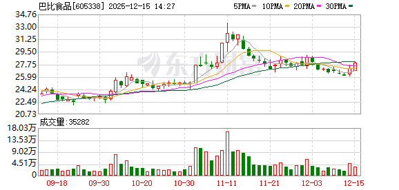 | 251103 | 巴比食品 | 登录 | 大消费 | 四中全会公报发布:要大力提振消费 | 公司为国内中式面点速冻食品龙头,前三季度扣非净利润增长19.4% | 10.00 | 27.6 | 4.42% | 2.83亿 | 66.12亿 | 66.12亿 100% | 2748.68 1万手 | 9.7% | 130634 130634 | 0 | 1 | 食品饮料 | 食品饮料,上海板块,养老金,宠物经济,电... 更多 |